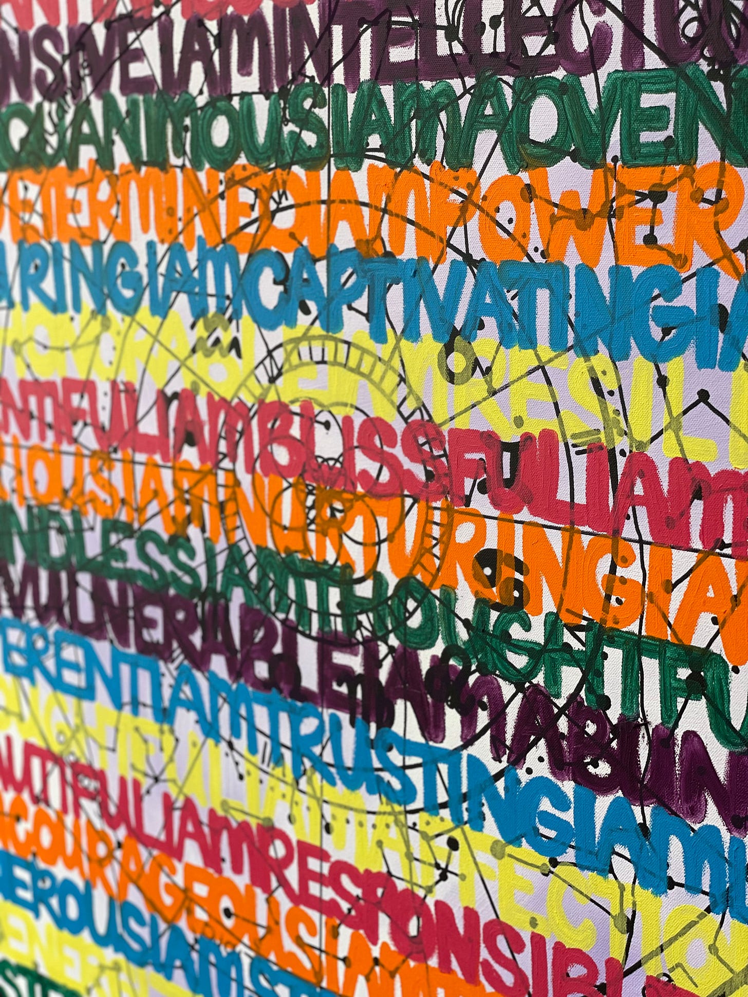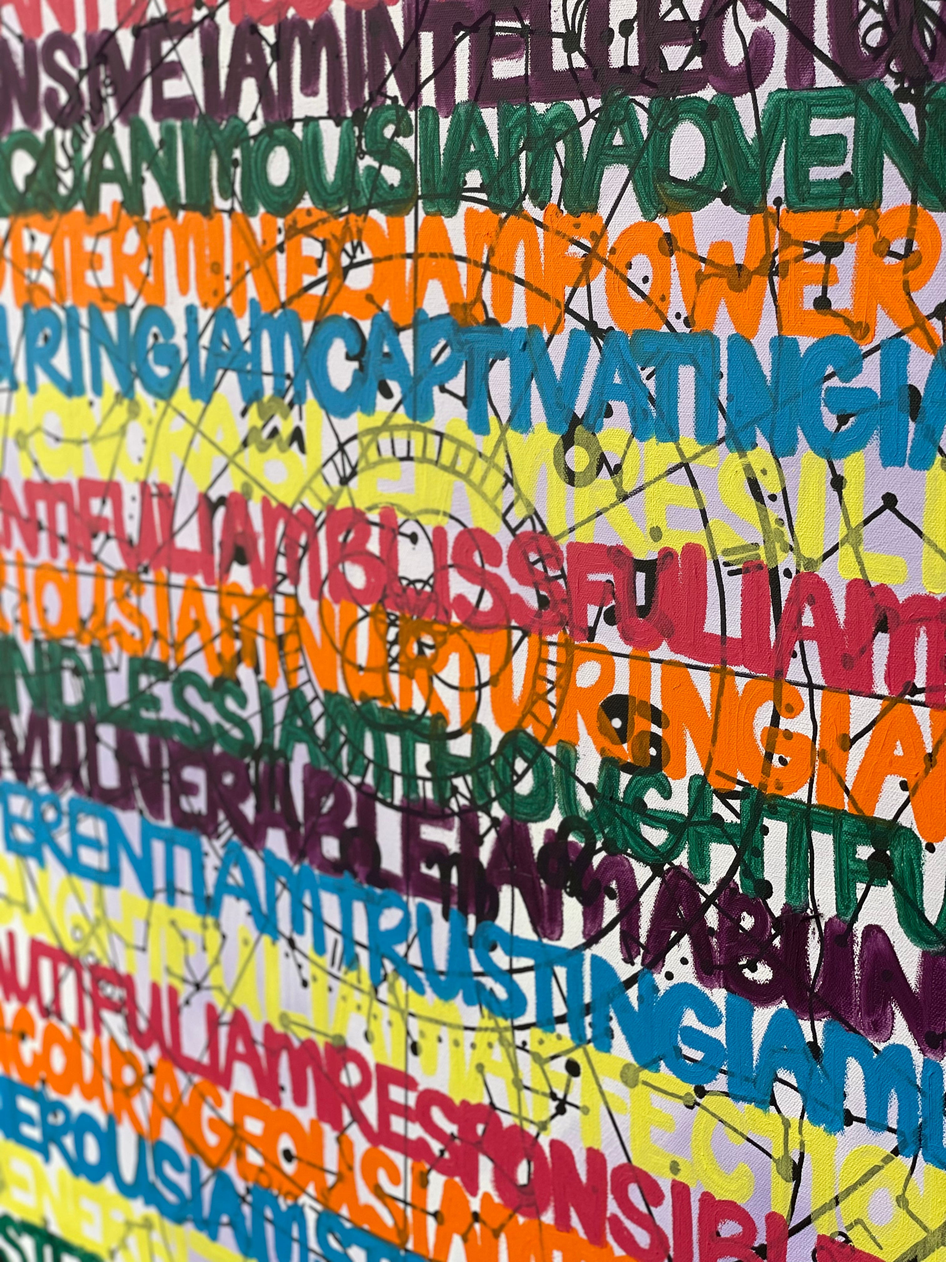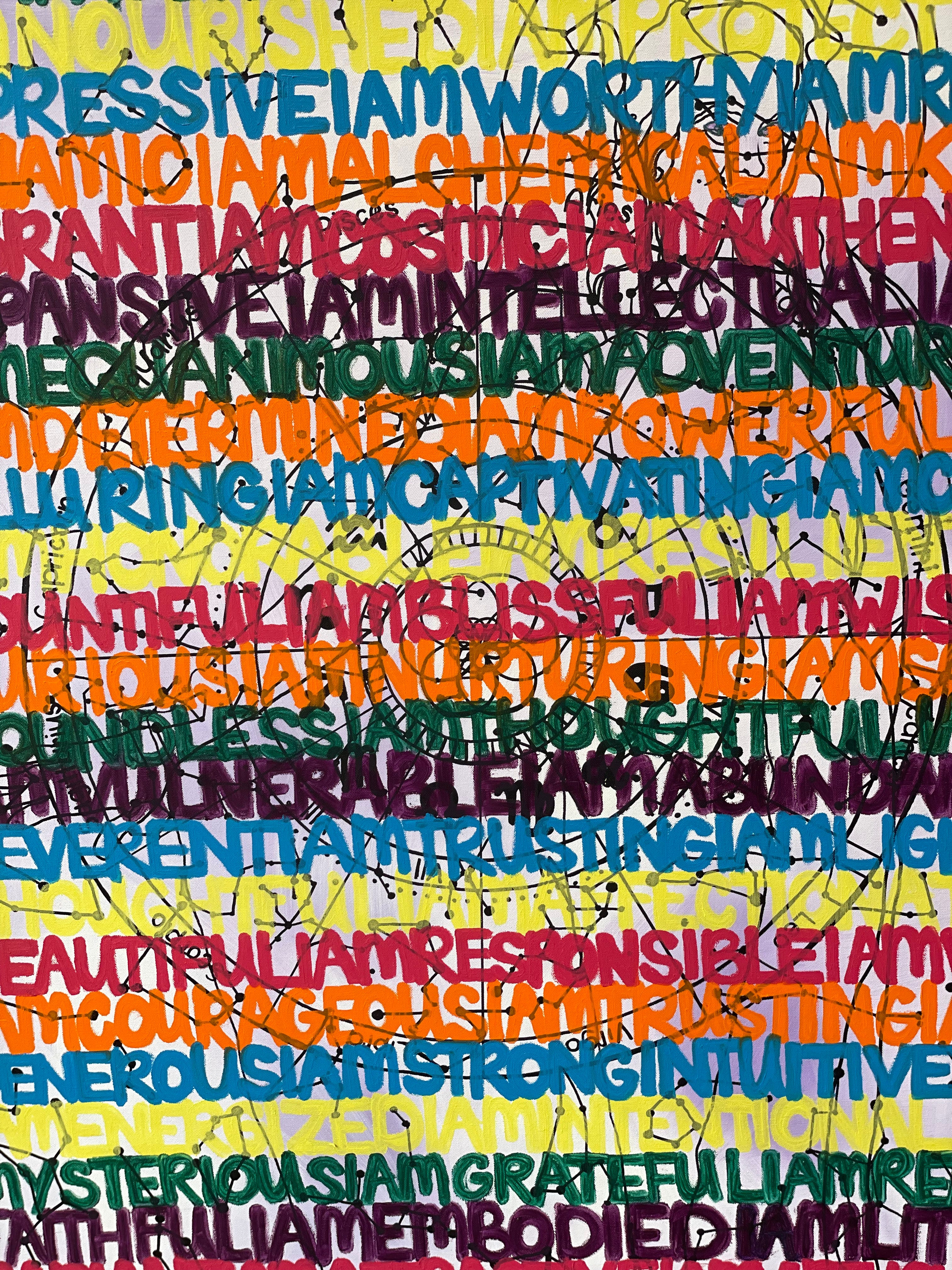 The Ever-Unfolding Self series includes layers of sacred geometry, specific astrological & cosmological inspiration of the Northern Hemisphere, a variety of postural silhouettes dancing atop the surface as a self portrait diving into love. I Am affirmations are painted in oil as a vibrant positive, powerful layer of statements meant to transform limiting beliefs & align with the highest vibrational frequency possible. These powerful affirmations amplify positive neural plasticity by tapping into the quantum field through the power if feeling. This experience casts spells to bring your dreams into reality. When we're tapped into our innate gifts and honor our joy, we expand time, increase our joy, and attract abundance.