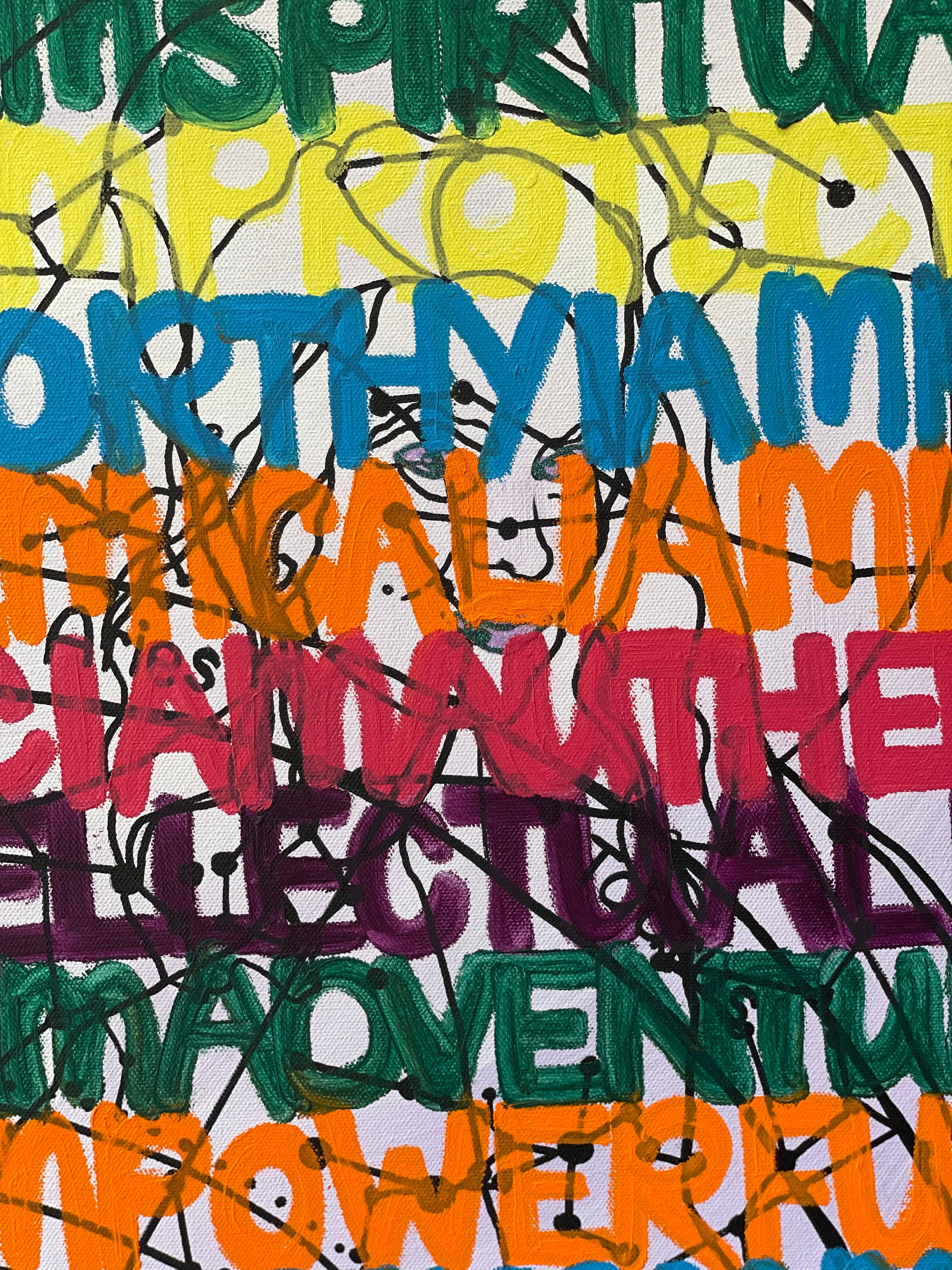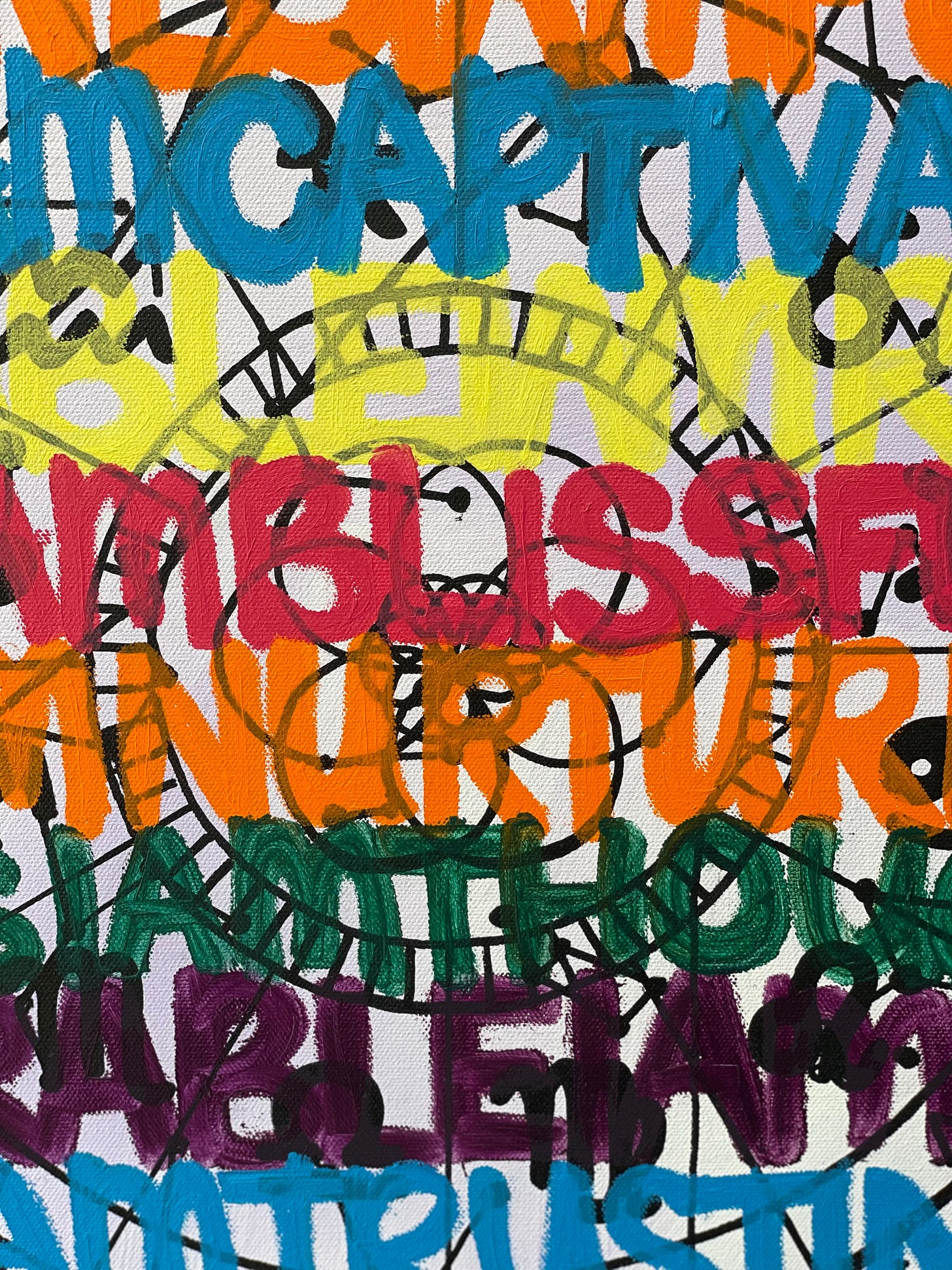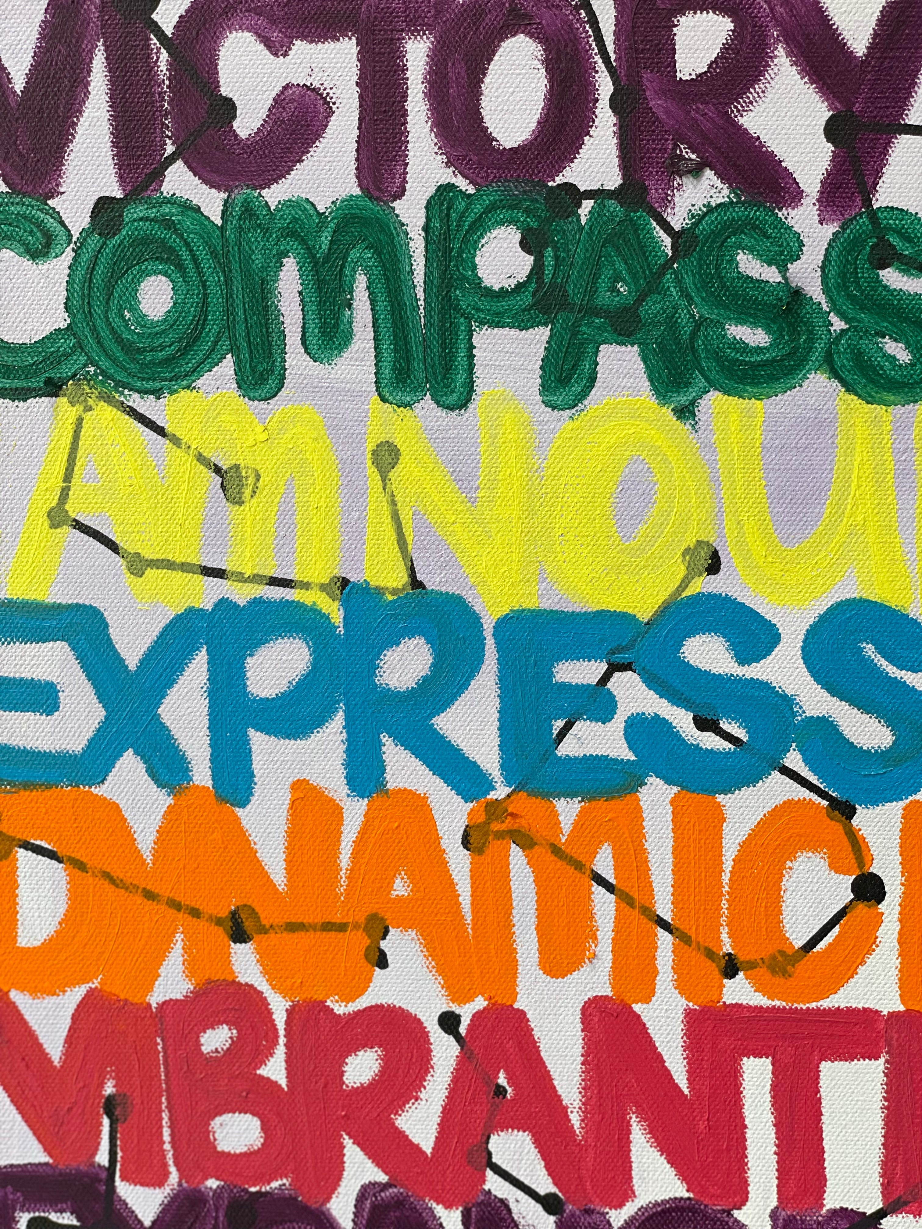 The Ever-Unfolding Self series includes layers of sacred geometry, specific astrological & cosmological inspiration of the Northern Hemisphere, a variety of postural silhouettes dancing atop the surface as a self portrait diving into love. I Am affirmations are painted in oil as a vibrant positive, powerful layer of statements meant to transform limiting beliefs & align with the highest vibrational frequency possible. These powerful affirmations amplify positive neural plasticity by tapping into the quantum field through the power if feeling. This experience casts spells to bring your dreams into reality. When we're tapped into our innate gifts and honor our joy, we expand time, increase our joy, and attract abundance.